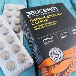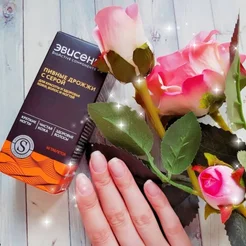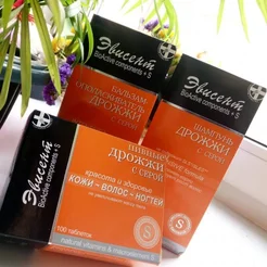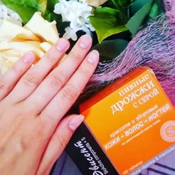 Пивные дрожжи с серой от российского производителя Эвисент. Мои волосы быстро растут и теряют блеск, но уже через неделю приобрели силу и красиво блестят на солнышке. Обычно раз в 5 дней один из ногтей ломается у края. Прошло 2 недели, ни один не пострадал. Лицо сияет, поры очищены и сужены.