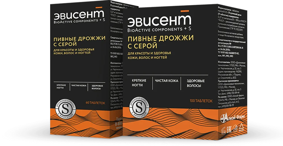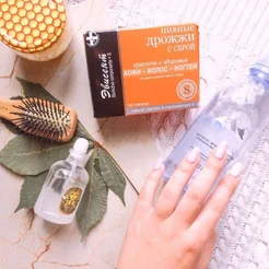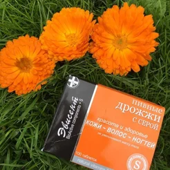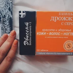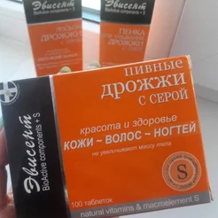 Пивные дрожжи с серой от российского производителя Эвисент. Мои волосы быстро растут и теряют блеск, но уже через неделю приобрели силу и красиво блестят на солнышке. Обычно раз в 5 дней один из ногтей ломается у края. Прошло 2 недели, ни один не пострадал. Лицо сияет, поры очищены и сужены.